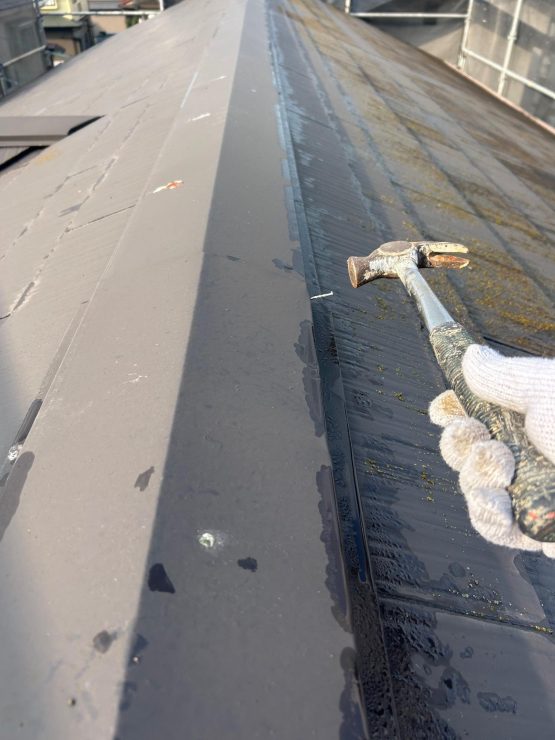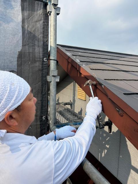 高圧洗浄の前の コロニアル瓦の抑え鋼板の経年によって釘の飛び出たものを探し