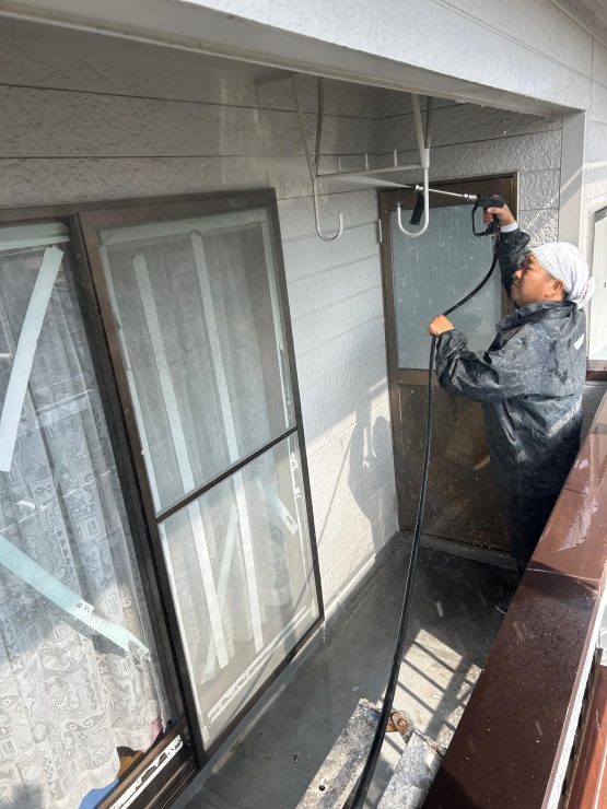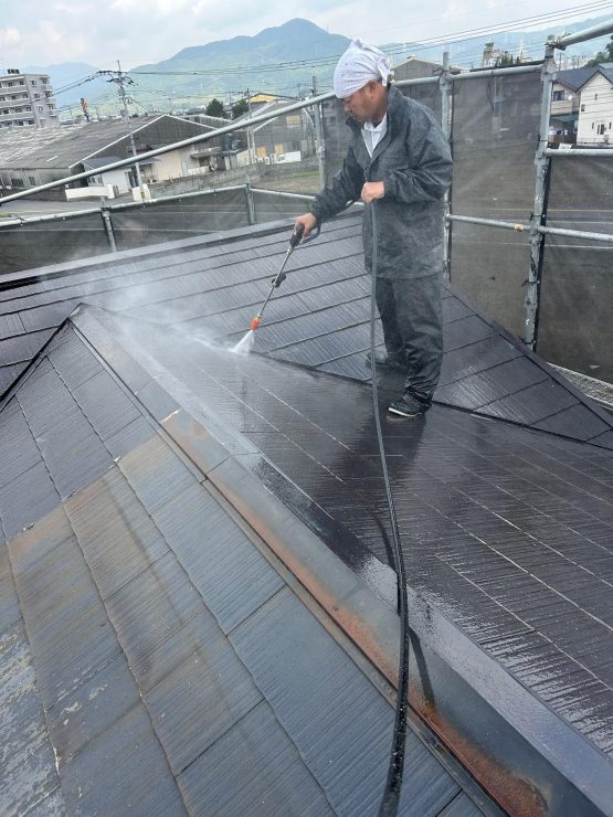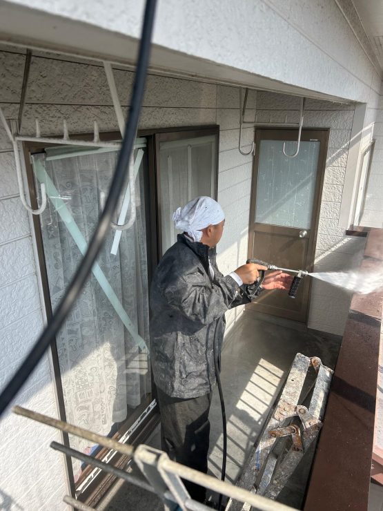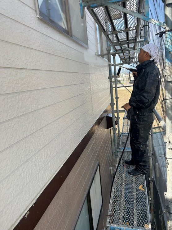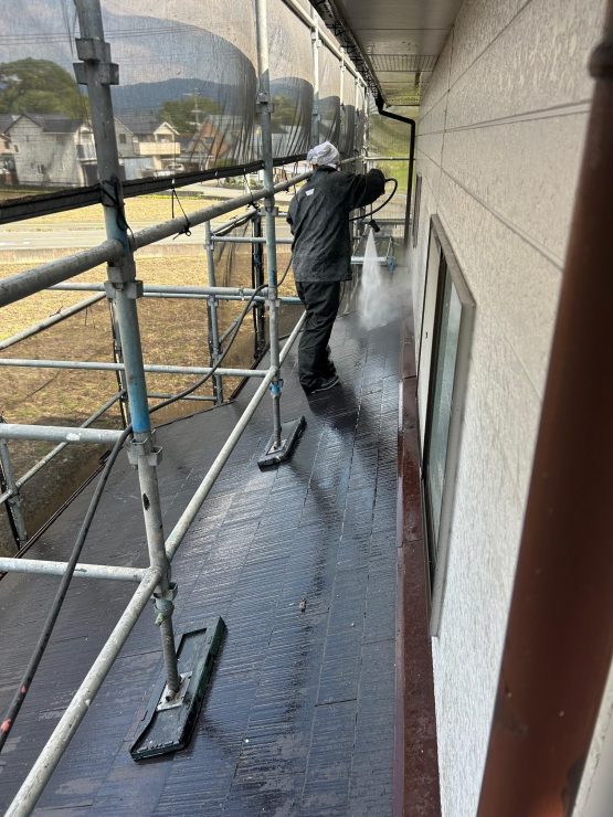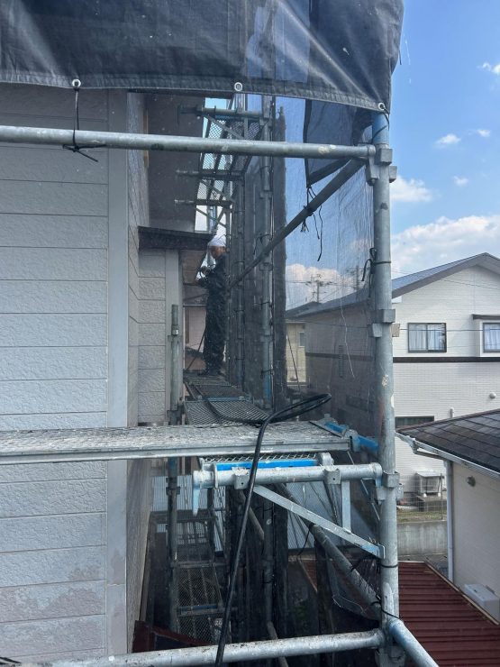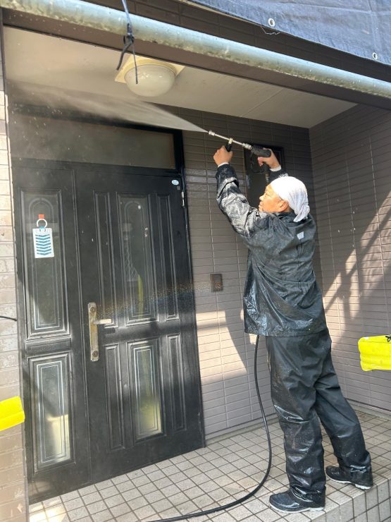 建物全体の高圧洗浄作業を無事しっかりと本日行っていきました。