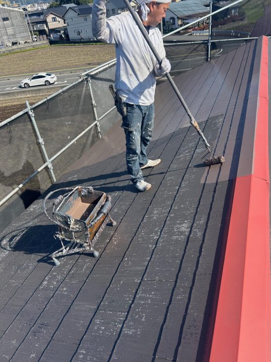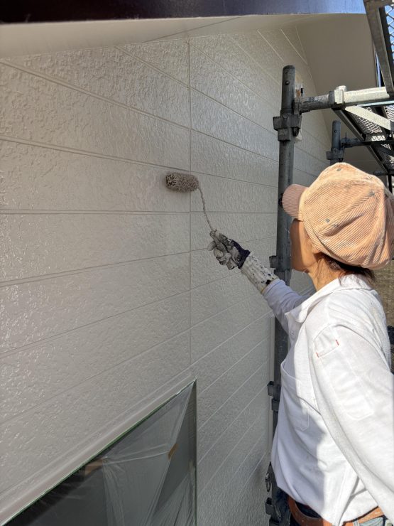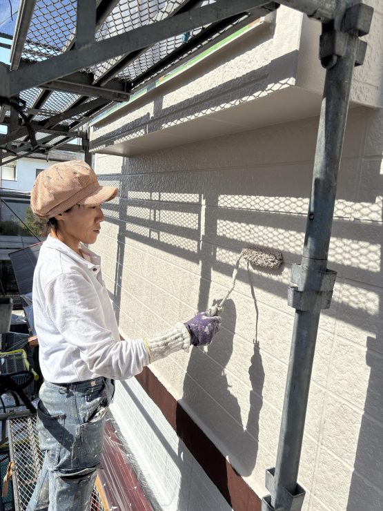 塗装をする付帯部の「中塗り」を弱溶剤シリコン塗料(ファインSI)にて