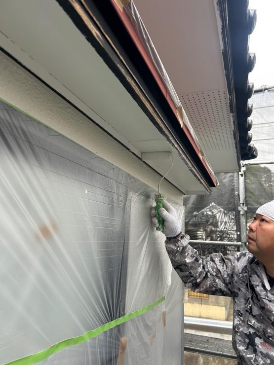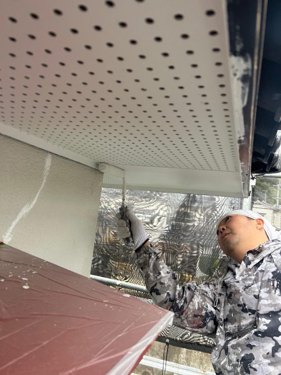 玄関ポーチの天井も「上塗り」をして しっかりと塗料が下地のお色が
