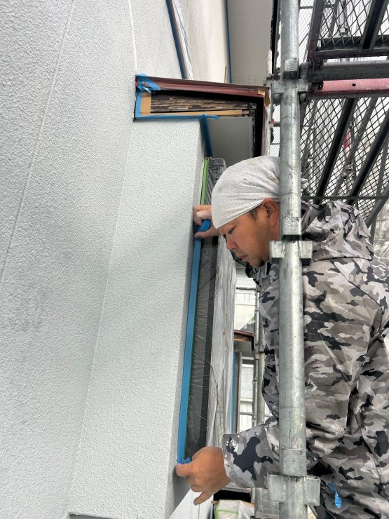 例えば サッシを汚さないための養生も 真っすぐとラインが出るようにテープを貼り