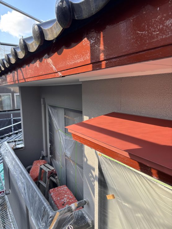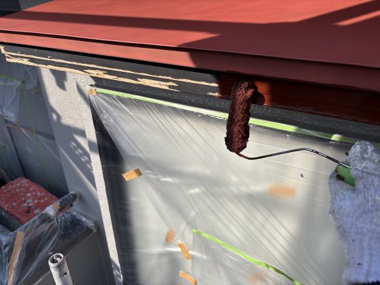 庇など鉄製部分へは 養生前に「下塗り」としまして 錆止め塗装を行っております