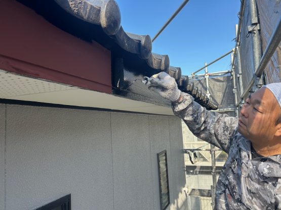 下屋根との取り合い部分の鉄板も塗装して印象を引き締めていきます。