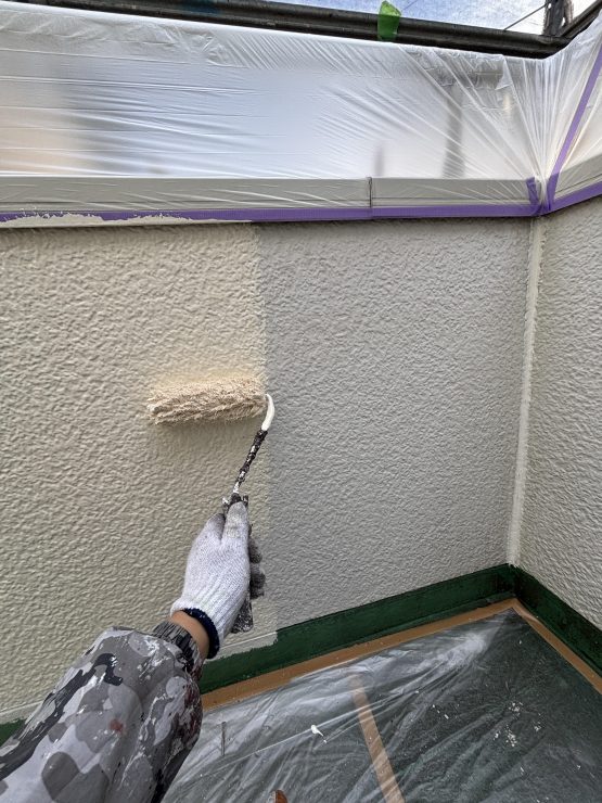 セミフロンバインダーSIⅡという塗料にて 軒天井と外壁を「下塗り」します。